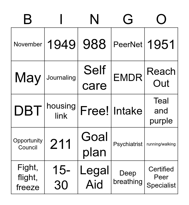 This bingo card has a free space and 24 words: 211, 15-30, Self care, Fight, flight, freeze, 1951, November, May, 1949, Intake, Goal plan, EMDR, DBT, Psychiatrist, running/walking, Journaling, Deep breathing, Teal and purple, 988, Reach Out, housing link, Certified Peer Specialist, Opportunity Council, PeerNet and Legal Aid.