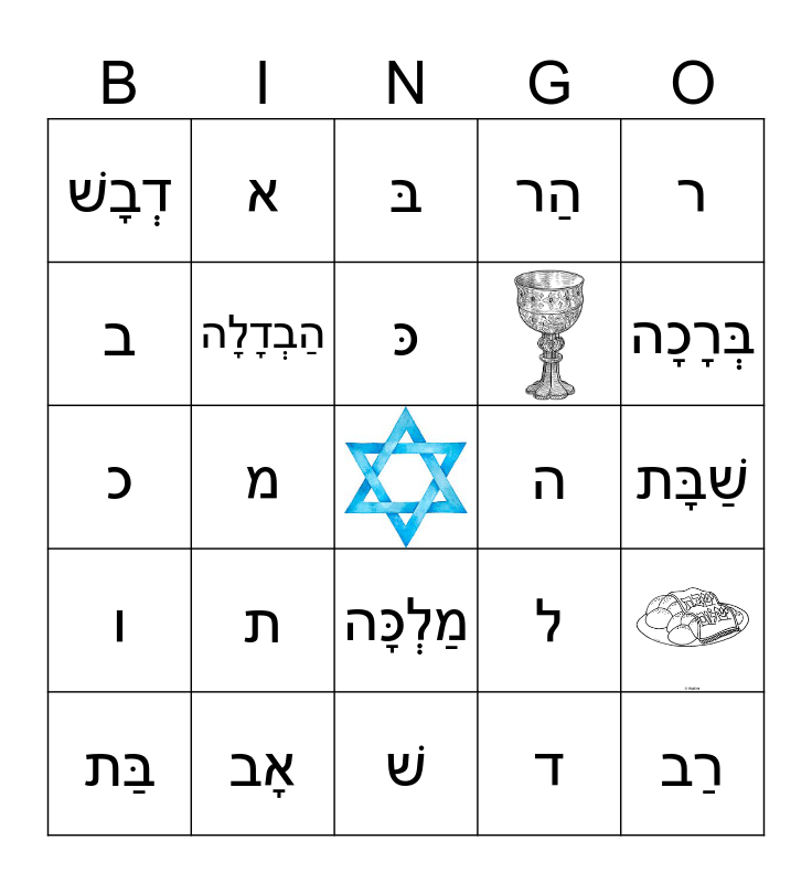 This bingo card has 2 images, a free space and 22 words: ת, אָב, כּ, בַּת, ר, דְבָשׁ, ב, א, ה, מַלְכָּה, כ, ל, הַבְדָלָה, ד, שַׁבָּת, בּ, בְּרָכָה, מ, רַב, ו, הַר and שׁ.
