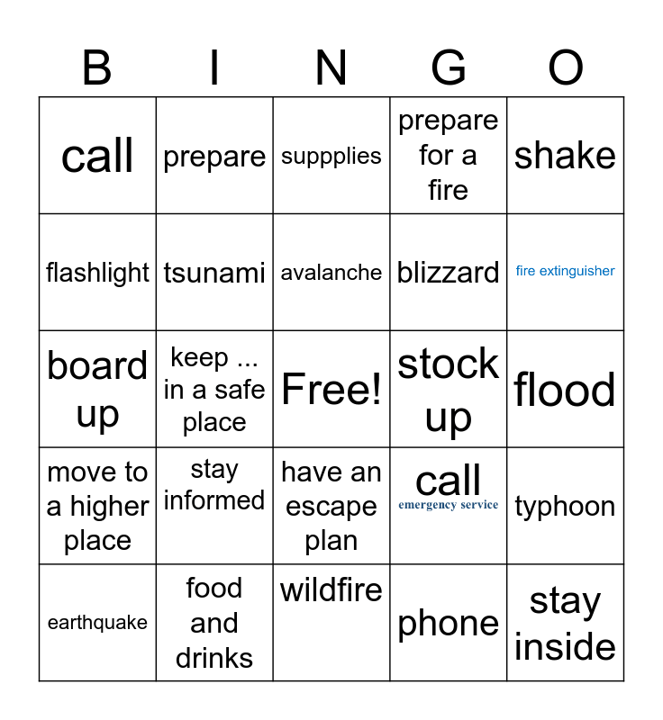 This bingo card has 2 images, a free space and 24 words: stay informed, wildfire, avalanche, earthquake, shake, call, flashlight, prepare, stock up, have an escape plan, blizzard, board up, call, typhoon, tsunami, drought, flood, suppplies, keep ... in a safe place, stay inside, food and drinks, move to a higher place, prepare for a fire and phone.