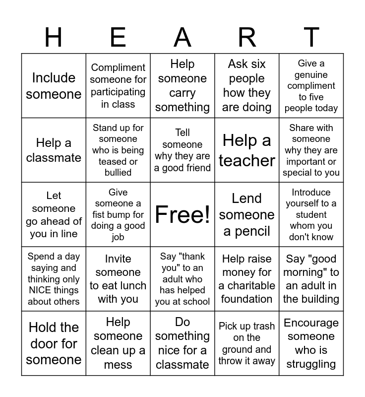 This bingo card has a free space and 24 words: Invite someone to eat lunch with you, Help someone clean up a mess, Tell someone why they are a good friend, Hold the door for someone, Give a genuine compliment to five people today, Include someone, Help a classmate, Compliment someone for participating in class, Lend someone a pencil, Say "thank you" to an adult who has helped you at school, Help a teacher, Let someone go ahead of you in line, Help raise money for a charitable foundation, Say "good morning" to an adult in the building, Stand up for someone who is being teased or bullied, Pick up trash on the ground and throw it away, Introduce yourself to a student whom you don't know, Help someone carry something, Share with someone why they are important or special to you, Give someone a fist bump for doing a good job, Encourage someone who is struggling, Spend a day saying and thinking only NICE things about others, Ask six people how they are doing and Do something nice for a classmate.