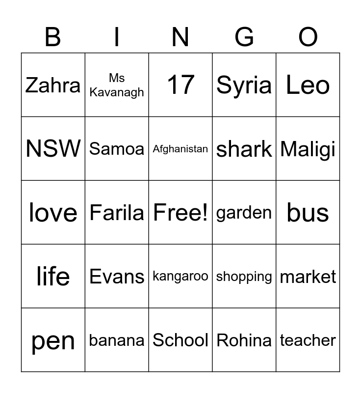 This bingo card has a free space and 50 words: Blacktown, teacher, Mount Druitt, School, Evans, English, Ms Kavanagh, Sydney, NSW, Australia, Samoa, Syria, market, shopping, China, Turkey, Afghanistan, garden, Qixuan, Leo, Farila, Rohina, Zahra, shark, Baba Yaga, Anya, Maligi, birthday, 17, kangaroo, Cinar, car, Christmas, party, banana, doctor, police, lawyer, Mr Morgan, bus, student, classroom, computer, workbook, pen, love, beautiful, talking, life and sun.