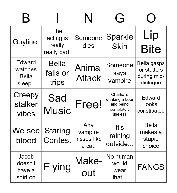 This bingo card has a free space and 24 words: Staring Contest, Flying, Animal Attack, Jacob doesn't have a shirt on, Lip Bite, Guyliner, Edward watches Bella sleep.., The acting is really really bad., Charlie is drinking a beer and being completely useless, Any vampire hisses like a cat., Someone says vampire, Creepy stalker vibes, It's raining outside..., Bella makes a stupid choice, Bella falls or trips, No human would wear that..., Edward looks constipated, Someone dies, Bella gasps or stutters during mid-dialogue, Sad Music, FANGS, We see blood, Sparkle Skin and Make-out.