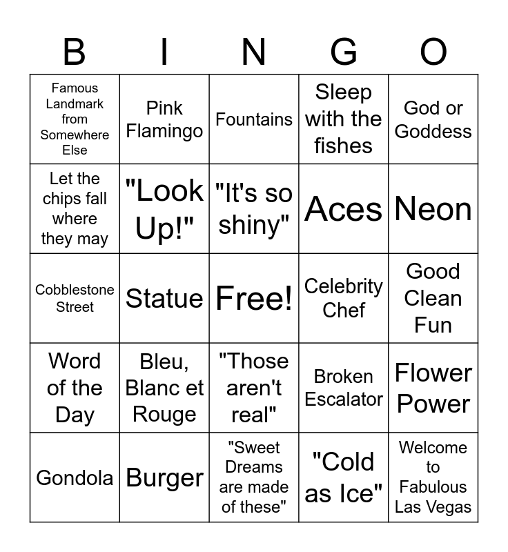 This bingo card has a free space and 29 words: Gondola, "All you need is love", Statue, Trees, Famous Landmark from Somewhere Else, Fountains, "Look Up!", Bleu, Blanc et Rouge, Celebrity Chef, Burger, Good Clean Fun, Welcome to Fabulous Las Vegas, "Sweet Dreams are made of these", "Cold as Ice", Neon, Mobsters, "Those aren't real", Word of the Day, God or Goddess, Cobblestone Street, Broken Escalator, Buffet, Aces, Let the chips fall where they may, Sleep with the fishes, Pink Flamingo, Flower Power, "It's so shiny" and Outside Inside.