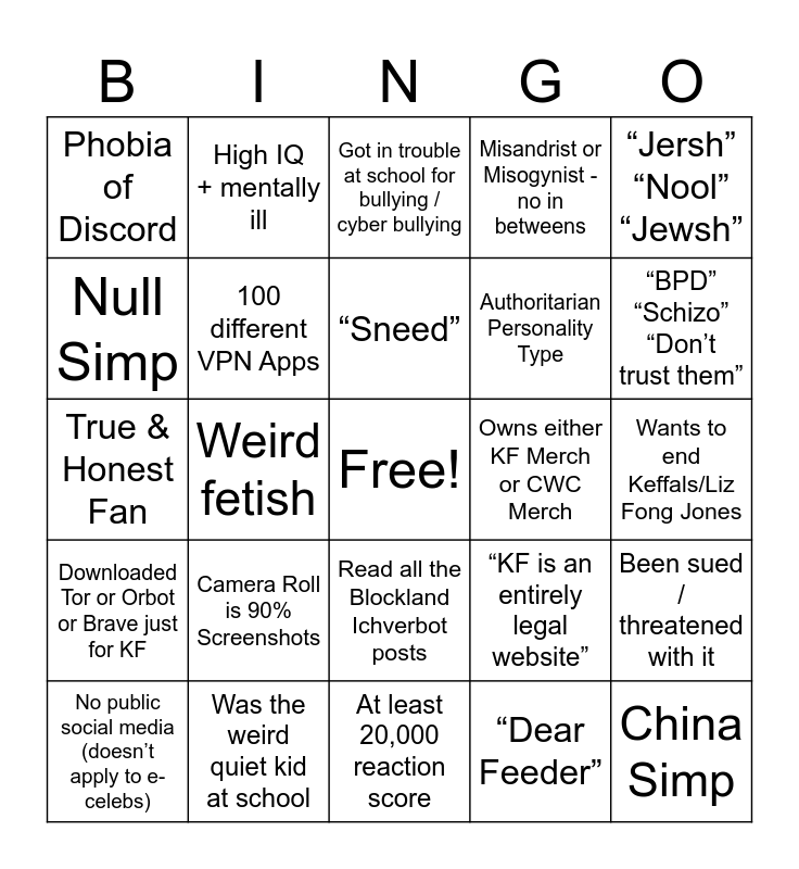This bingo card has a free space and 24 words: Camera Roll is 90% Screenshots, Was the weird quiet kid at school, “Sneed”, No public social media (doesn’t apply to e-celebs), “Jersh” “Nool” “Jewsh”, Phobia of Discord, Null Simp, High IQ + mentally ill, Owns either KF Merch or CWC Merch, Read all the Blockland Ichverbot posts, Authoritarian Personality Type, True & Honest Fan, “KF is an entirely legal website”, Been sued / threatened with it, 100 different VPN Apps, “Dear Feeder”, Wants to end Keffals/Liz Fong Jones, Got in trouble at school for bullying / cyber bullying, “BPD” “Schizo” “Don’t trust them”, Weird fetish, China Simp, Downloaded Tor or Orbot or Brave just for KF, Misandrist or Misogynist - no in betweens and At least 20,000 reaction score.