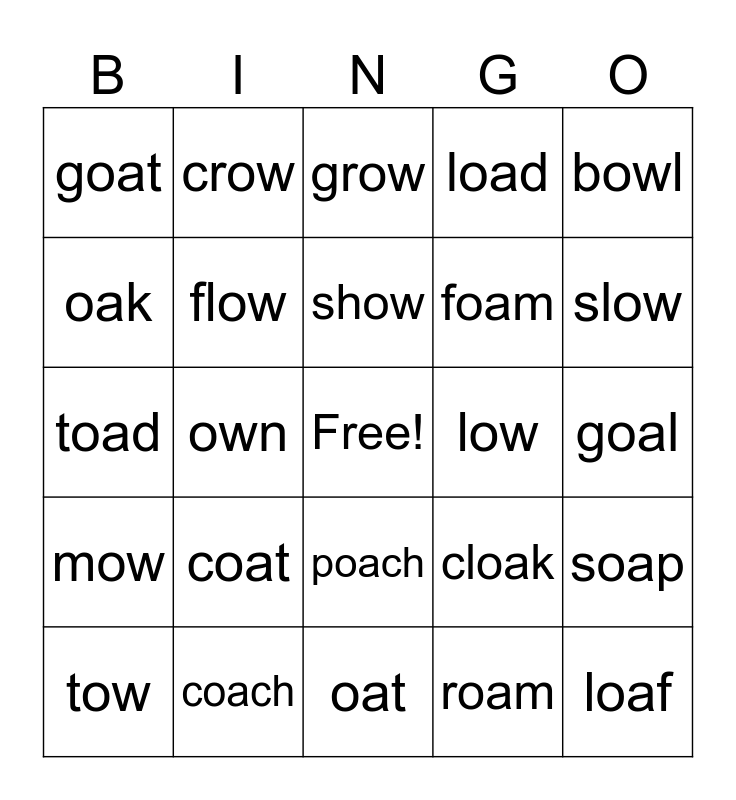 This bingo card has a free space and 33 words: snow, row, own, bow, mow, flow, bowl, tow, crow, glow, show, grow, stow, blow, low, slow, coach, toad, coat, cloak, poach, coal, goat, goal, oat, loaf, load, foam, oak, soap, road, roam and boat.