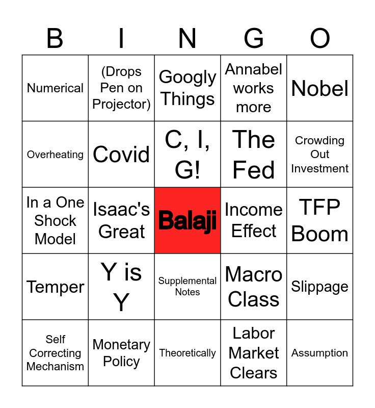 This bingo card has a free space and 37 words: Unambigously, London Week, Write this down Courtney, Covid, Slippage, Y is Y, C, I, G!, Ambigous, Nobel, Empirically, Isaac's Great, Annabel works more, Assumption, TFP Boom, Overheating, Temper, Wage Inflation Spiral, Googly Things, Supplemental Notes, Income Effect, Numerical, Crowding Out Investment, Self Correcting Mechanism, Theoretically, One Last Thing, Labor Market Clears, (Drops Pen on Projector), Like you did in the midterm, endogenously, Intuition, Gory Detail, Monetary Policy, In a One Shock Model, What I really want to convey, Macro Class, The Fed and Interest Rates.