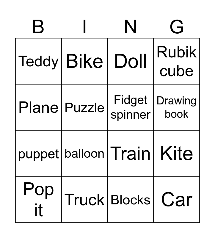 This bingo card has 16 words: Truck, Kite, Doll, Teddy, puppet, Bike, Train, Blocks, Plane, Puzzle, Pop it, Rubik cube, balloon, Drawing book, Fidget spinner and Car.
