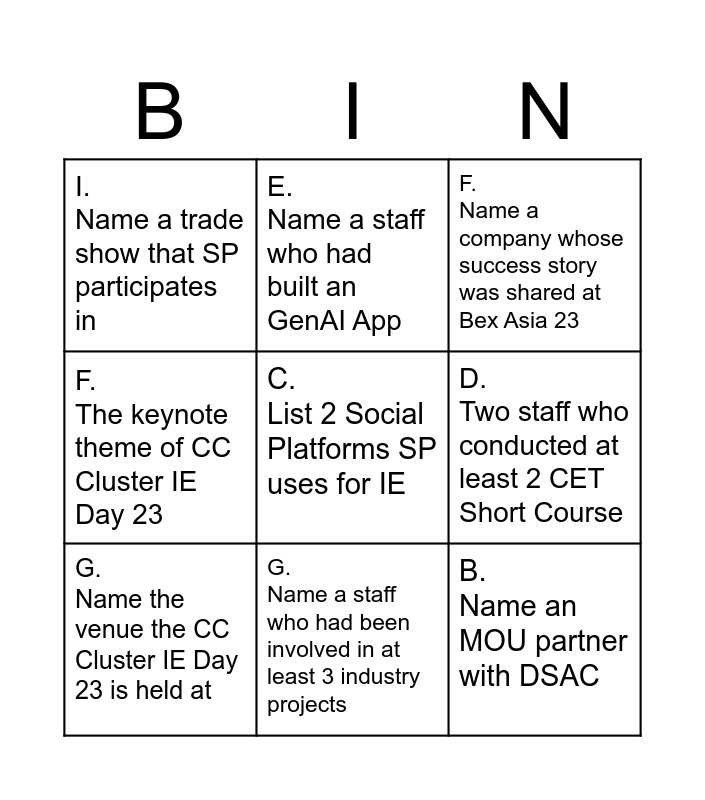 This bingo card has 12 words: A. Name of the Speaker of CC Cluster IE Day 23, B. Name an MOU partner with DSAC, C. List 2 Social Platforms SP uses for IE, D. Two staff who conducted at least 2 CET Short Course, E. Name a staff who had built an GenAI App, F. Name a company whose success story was shared at Bex Asia 23, G. Name a staff who had been involved in at least 3 industry projects, H. MS AI Lead brings participants to _______ in China, I. Name a trade show that SP participates in, F. The keynote theme of CC Cluster IE Day 23, G. Name the venue the CC Cluster IE Day 23 is held at and H. Name the two MCs for CC Cluster IE Day 23.