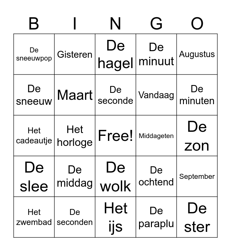 This bingo card has a free space and 103 words: Aankleden, April, Augustus, Avondeten, De avond, De ballonnen, De bladeren, De bliksem, De bloemen, De bloesem, De confetti, De dag, De dag, De dagen, De donder, De feestmuts, De hagel, De handschoenen, De kaarsjes, De kaart, De klok, De maan, De maand, De maand, De maanden, De middag, De minuten, De minuut, De muts, De nacht, De ochtend, De paraplu, De parasol, De regen, De regen, De regenlaarzen, De regenplas, De schaatsen, De seconde, De seconden, De sjaal, De slee, De slingers, De sneeuw, De sneeuw, De sneeuwpop, De snoepjes, De ster, De strik, De taart, De temperatuur, De thee, De tijd, De uren, De verjaardag, De week, De week, De weken, De wind, De wolk, De zon, December, Dinsdag, Donderdag, Douchen, Eergisteren, Februari, Gisteren, Het cadeautje, Het horloge, Het ijs, Het ijsje, Het jaar, Het onweer, Het strand, Het uur, Het weekend, Het zwembad, Januari, Juli, Juni, Maandag, Maart, Mei, Middageten, Morgen, Naar school gaan, November, Oktober, Ontbijten, Opstaan, Overmorgen, September, Slapen, Spelen, Tanden poetsen, Vandaag, Voorlezen, Vrijdag, Wakker worden, Woensdag, Zaterdag and Zondag.