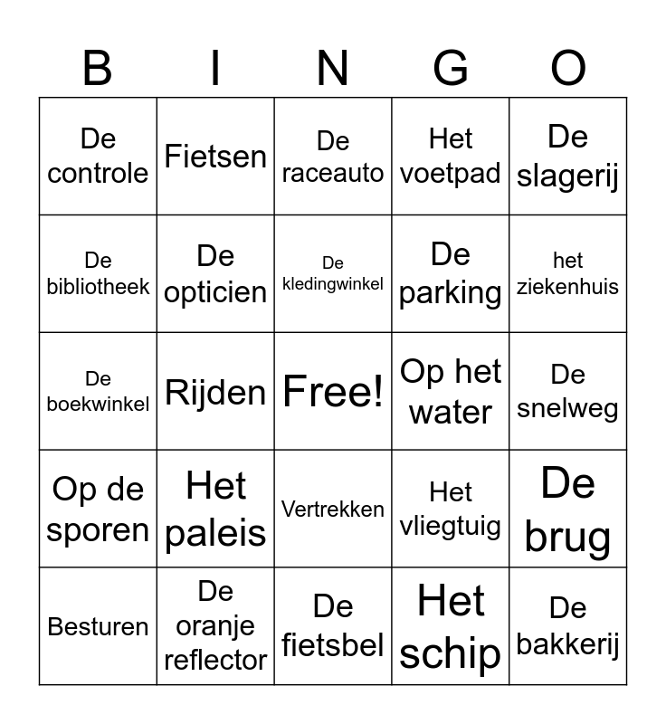 This bingo card has a free space and 148 words: De auto, De trein, De tram, De bus, De metro, Het vliegtuig, De helikopter, De luchtballon, De taxi, De boot, De vrachtwagen, De fiets, De step, De tractor, De motor, De tandem, De fietser, De voetganger, Het verkeerslicht, Het zebrapad, De politieagent, De brug, Stoppen, Wachten, Stappen, Rijden, Fietsen, Oversteken, De bestuurder, Het station, De halte, Het park, Het plein, De snelweg, Het kruispunt, De rotonde, De ambulance, De brandweerwagen, De parking, Het fietspad, De fietsenstalling, Aankomen, Vertrekken, Opstappen, Afstappen, Instappen, Uitstappen, Het perron, De file, De tunnel, De overweg, Parkeren, Besturen, Steppen, De politie, De politiewagen, Varen, Vliegen, De roeiboot, De kar, De raceauto, De raket, Het schip, De scooter, In de lucht, Op het water, Op de sporen, Op de weg, Het opstijgen, Het landen, Het taxiën, De bagage, De controle, De bagagecontrole, Het vliegticket, Het paspoort, De parachute, Het vliegveld, Het treinticket, Het voetpad, Het loket, De reiziger, Het verkeersbord, Een lekke band, Een band plakken, Het ventiel, De fietspomp, Het voorlicht, Het achterlicht, De fietsbel, De rem, De witte reflector, De rode reflector, De trappers / De pedalen, De oranje reflector, Het wiel / De band, De fietsketting, De spaken, Het stuur, De bagagedrager, Het zadel, De bank, De bibliotheek, Het restaurant, Het zwembad, De sportschool, Het vliegveld, De autogarage, De kerk, Het treinstation, De parkeergarage, De circustent, De kapper, De opticien, Het paleis, Het kasteel, het ziekenhuis, De groentewinkel, De bakkerij, De slagerij, De speelgoedwinkel, De boekwinkel, De supermarkt, De fietsenwinkel, De kledingwinkel, De muziekwinkel, De meubelzaak, De viswinkel, De apotheek, De bloemenwinkel, De dierenwinkel, De schoenenwinkel, De juwelier, Het vliegveld, Het vliegtuig, De cockpit, De stewardess, De koffer, Het paspoort, Het vliegticket, De vliegreis, De verkeerstoren, De bagage, De bagageband, De piloot, Opstijgen, Landen and Het afscheid.