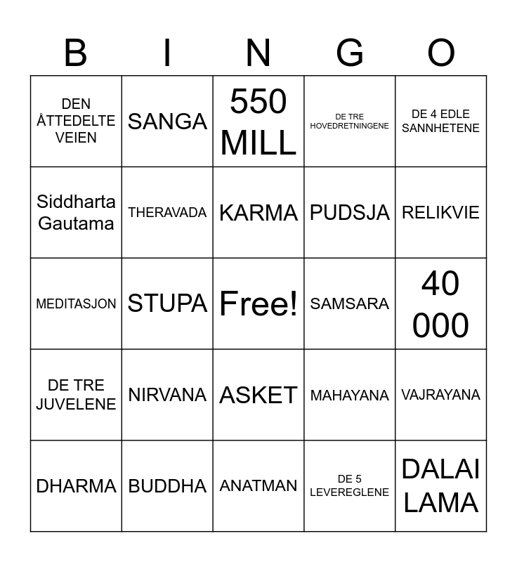 This bingo card has a free space and 24 words: NIRVANA, BUDDHA, KARMA, DHARMA, DE 4 EDLE SANNHETENE, DEN ÅTTEDELTE VEIEN, Siddharta Gautama, SANGA, SAMSARA, ASKET, PUDSJA, MEDITASJON, MAHAYANA, VAJRAYANA, THERAVADA, DE 5 LEVEREGLENE, 40 000, 550 MILL, RELIKVIE, STUPA, DALAI LAMA, DE TRE JUVELENE, DE TRE HOVEDRETNINGENE and ANATMAN.