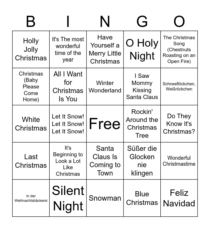 This bingo card has a free space and 40 words: Jingle Bells, White Christmas, Rudolph the Red-Nosed Reindeer, All I Want for Christmas Is You, Silent Night, Santa Claus Is Coming to Town, Winter Wonderland, Frosty the Snowman, The Christmas Song (Chestnuts Roasting on an Open Fire), Last Christmas, Let It Snow! Let It Snow! Let It Snow!, O Holy Night, Feliz Navidad, Do They Know It's Christmas?, Rockin' Around the Christmas Tree, It's Beginning to Look a Lot Like Christmas, Silver Bells, Holly Jolly Christmas, Little Drummer Boy, Have Yourself a Merry Little Christmas, Wonderful Christmastime, Blue Christmas, I Saw Mommy Kissing Santa Claus, Christmas (Baby Please Come Home), Happy Xmas (War Is Over), Sleigh Ride, Please Come Home for Christmas, Here Comes Santa Claus, O Tannenbaum, Stille Nacht, Kling, Glöckchen, klingelingeling, In der Weihnachtsbäckerei, Ihr Kinderlein kommet, Süßer die Glocken nie klingen, Schneeflöckchen, Weißröckchen, Snowman, Santa tell me, Jingle bell rock, It's The most wonderful time of the year and Baby, it's cold outside.
