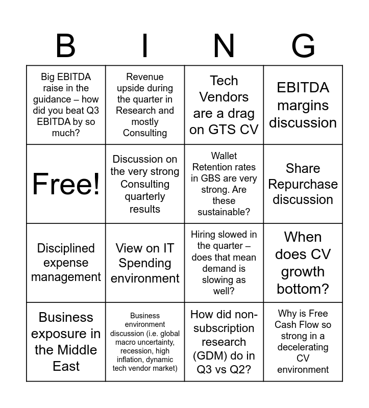 This bingo card has 16 words: Business environment discussion (i.e. global macro uncertainty, recession, high inflation, dynamic tech vendor market), When does CV growth bottom?, Tech Vendors are a drag on GTS CV, Big EBITDA raise in the guidance – how did you beat Q3 EBITDA by so much?, Disciplined expense management, Revenue upside during the quarter in Research and mostly Consulting, Hiring slowed in the quarter – does that mean demand is slowing as well?, How did non-subscription research (GDM) do in Q3 vs Q2?, Free!, Discussion on the very strong Consulting quarterly results, Business exposure in the Middle East, EBITDA margins discussion, View on IT Spending environment, Share Repurchase discussion, Wallet Retention rates in GBS are very strong. Are these sustainable? and Why is Free Cash Flow so strong in a decelerating CV environment.
