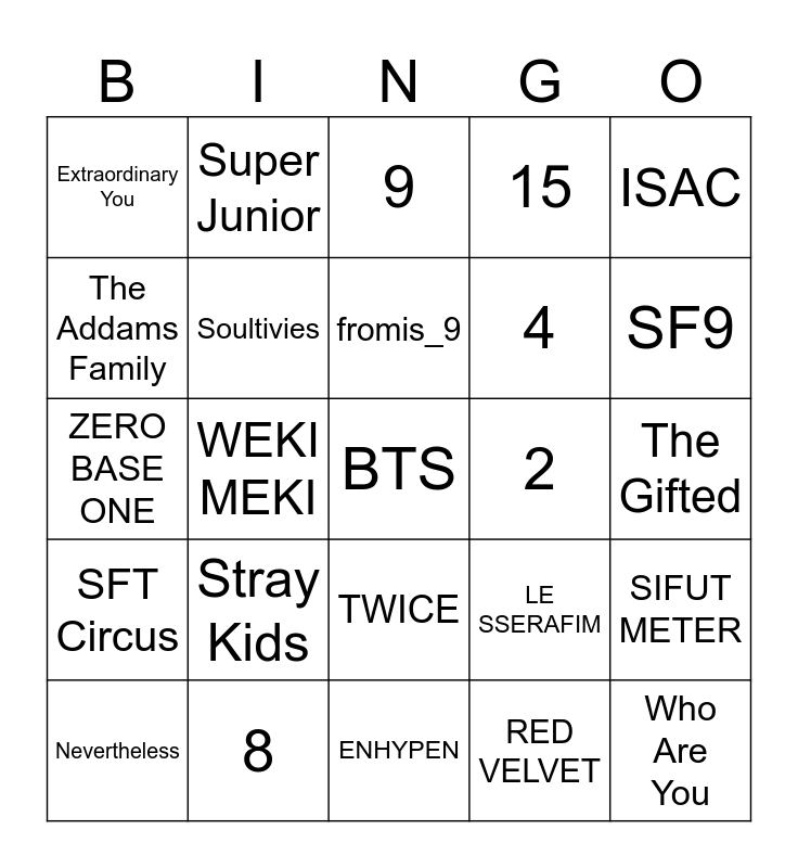 This bingo card has a free space and 24 words: Stray Kids, 8, fromis_9, Nevertheless, ISAC, Extraordinary You, The Addams Family, Super Junior, 2, TWICE, 4, ZERO BASE ONE, LE SSERAFIM, SIFUT METER, Soultivies, RED VELVET, The Gifted, 9, SF9, WEKI MEKI, Who Are You, SFT Circus, 15 and ENHYPEN.
