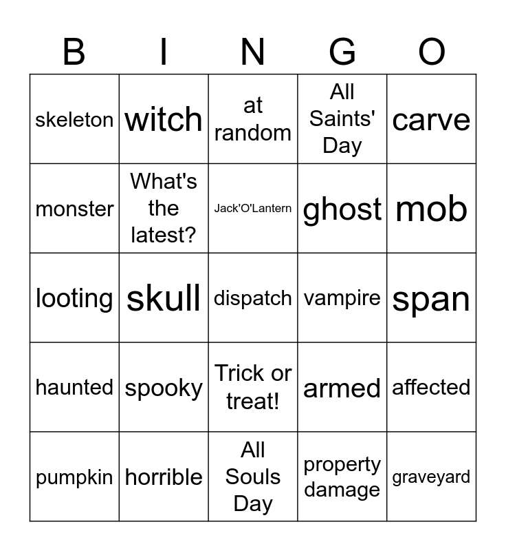 This bingo card has a free space and 24 words: spooky, horrible, Jack'O'Lantern, pumpkin, carve, skeleton, monster, witch, vampire, Trick or treat!, ghost, looting, armed, affected, What's the latest?, property damage, span, at random, mob, skull, graveyard, haunted, All Saints' Day and All Souls Day.