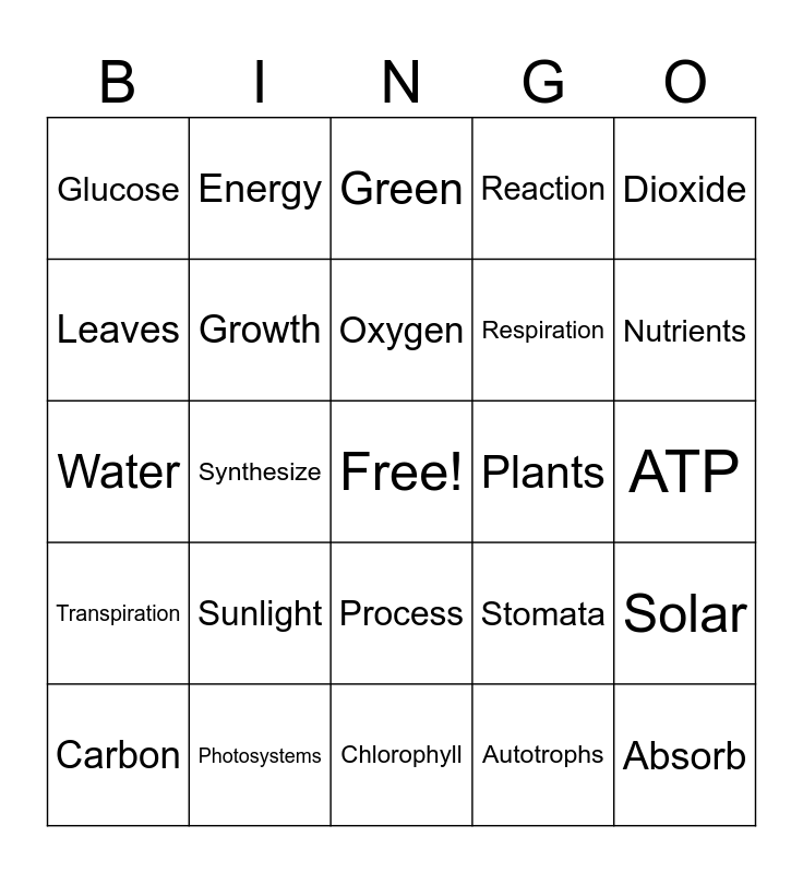 This bingo card has a free space and 25 words: Sunlight, Chlorophyll, Oxygen, Carbon, Dioxide, Glucose, Leaves, Energy, Plants, Process, Respiration, Water, Stomata, Solar, Growth, Sugar, ATP, Green, Nutrients, Synthesize, Absorb, Photosystems, Transpiration, Reaction and Autotrophs.