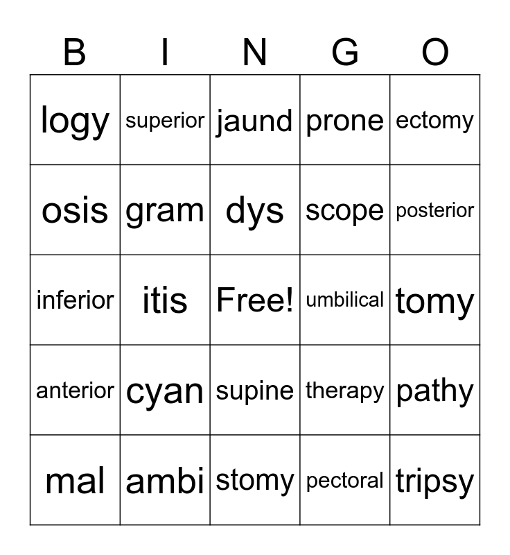 This bingo card has a free space and 24 words: cyan, ambi, dys, mal, ectomy, logy, osis, superior, umbilical, supine, scope, inferior, therapy, pathy, gram, pectoral, tomy, jaund, posterior, itis, tripsy, anterior, prone and stomy.