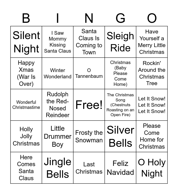 This bingo card has a free space and 30 words: Jingle Bells, White Christmas, Rudolph the Red-Nosed Reindeer, All I Want for Christmas Is You, Silent Night, Santa Claus Is Coming to Town, Winter Wonderland, Frosty the Snowman, The Christmas Song (Chestnuts Roasting on an Open Fire), Last Christmas, Let It Snow! Let It Snow! Let It Snow!, O Holy Night, Feliz Navidad, Do They Know It's Christmas?, Rockin' Around the Christmas Tree, It's Beginning to Look a Lot Like Christmas, Silver Bells, Holly Jolly Christmas, Little Drummer Boy, Have Yourself a Merry Little Christmas, Wonderful Christmastime, Blue Christmas, I Saw Mommy Kissing Santa Claus, Christmas (Baby Please Come Home), Happy Xmas (War Is Over), Sleigh Ride, Please Come Home for Christmas, Here Comes Santa Claus, O Tannenbaum and Stille Nacht.