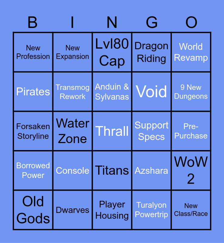 This bingo card has 25 words: Console, Player Housing, Anduin & Sylvanas, Old Gods, World Revamp, New Profession, Pirates, New Expansion, Support Specs, Titans, Void, Forsaken Storyline, Azshara, WoW 2, Transmog Rework, New Class/Race, Pre-Purchase, Lvl80 Cap, 9 New Dungeons, Water Zone, Thrall, Dwarves, Borrowed Power, Dragon Riding and Turalyon Powertrip.