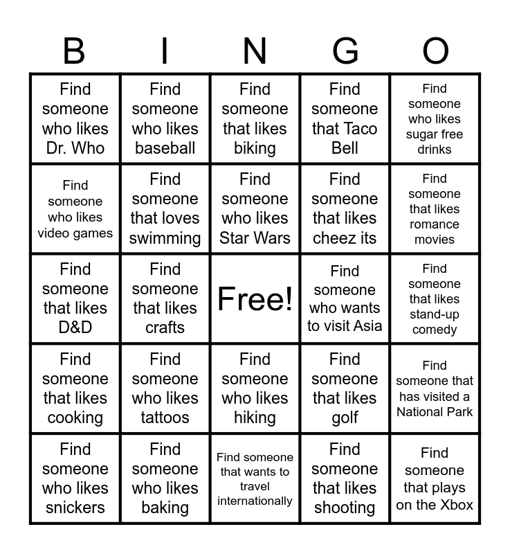 This bingo card has a free space and 24 words: Find someone who likes tattoos, Find someone who likes baking, Find someone who likes Star Wars, Find someone who likes snickers, Find someone who likes sugar free drinks, Find someone who likes Dr. Who, Find someone who likes video games, Find someone who likes baseball, Find someone who wants to visit Asia, Find someone who likes hiking, Find someone that likes cheez its, Find someone that likes D&D, Find someone that likes golf, Find someone that has visited a National Park, Find someone that loves swimming, Find someone that likes shooting, Find someone that likes stand-up comedy, Find someone that likes biking, Find someone that likes romance movies, Find someone that likes crafts, Find someone that plays on the Xbox, Find someone that likes cooking, Find someone that Taco Bell and Find someone that wants to travel internationally.