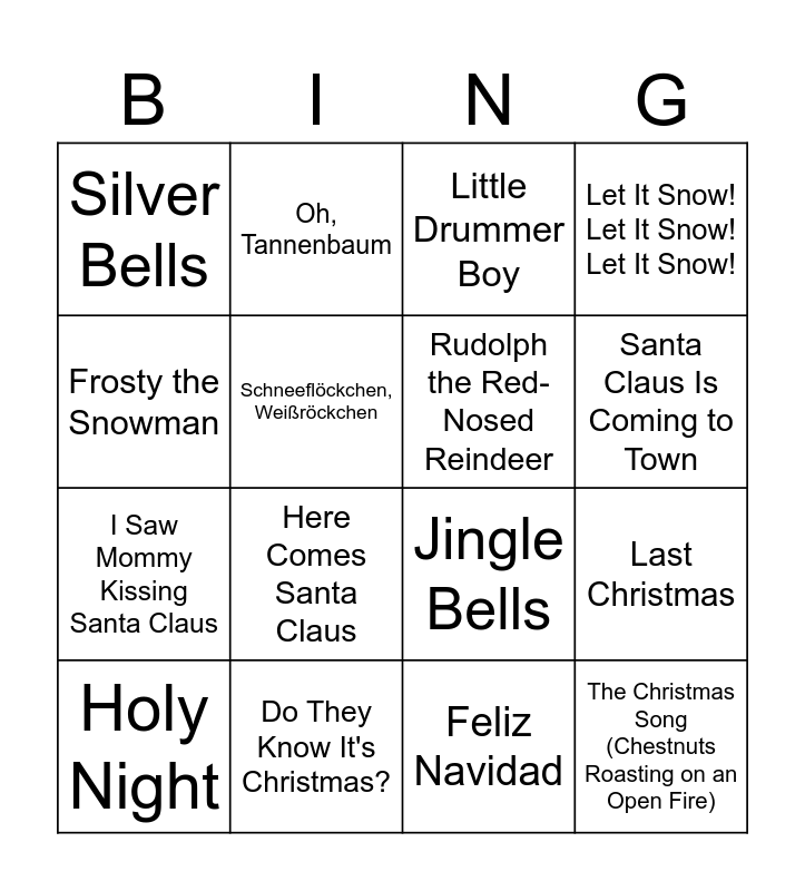 This bingo card has 41 words: Free!, Jingle Bells, White Christmas, Rudolph the Red-Nosed Reindeer, All I Want for Christmas Is You, Silent Night, Santa Claus Is Coming to Town, Winter Wonderland, Frosty the Snowman, The Christmas Song (Chestnuts Roasting on an Open Fire), Last Christmas, Let It Snow! Let It Snow! Let It Snow!, Holy Night, Feliz Navidad, Do They Know It's Christmas?, Rockin' Around the Christmas Tree, It's Beginning to Look a Lot Like Christmas, Silver Bells, Holly Jolly Christmas, Little Drummer Boy, Have Yourself a Merry Little Christmas, Wonderful Christmastime, Blue Christmas, I Saw Mommy Kissing Santa Claus, Christmas (Baby Please Come Home), Happy Xmas (War Is Over), Sleigh Ride, Please Come Home for Christmas, Here Comes Santa Claus, Tannenbaum, Stille Nacht, Oh, Tannenbaum, In der Weihnachtsbäckerei, Ihr Kinderlein kommet, Süßer die Glocken nie klingen, Schneeflöckchen, Weißröckchen, Snowman, Santa tell me, Jingle bell Rock, It's the most wonderful time of the year and baby, it's cold outside.