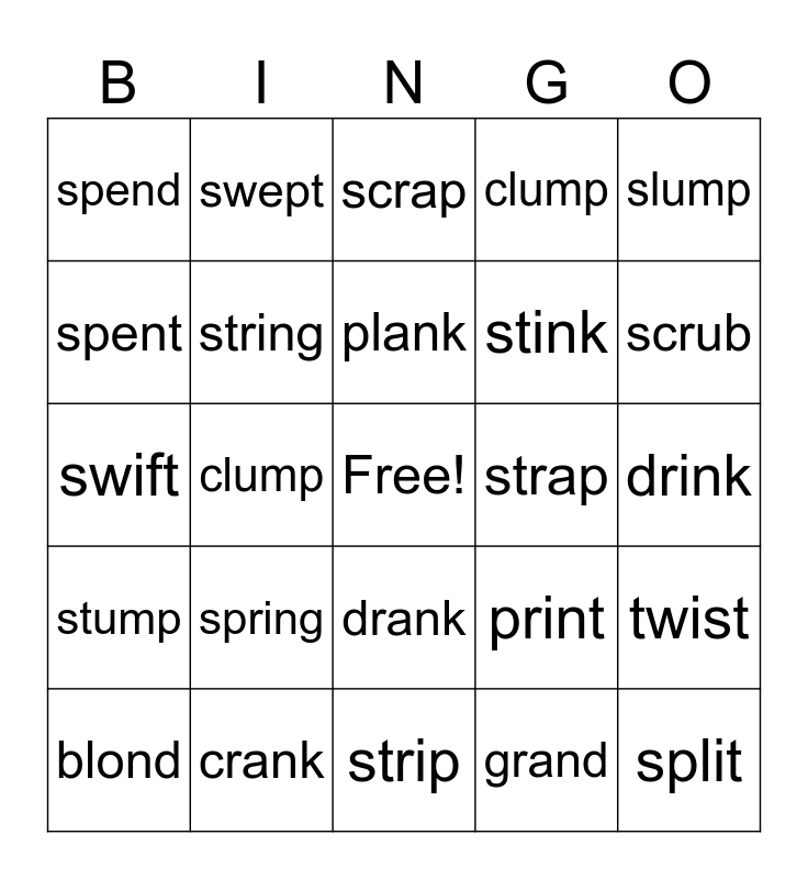 This bingo card has a free space and 26 words: drank, grand, plank, crank, slump, spend, spent, swept, drink, print, stink, swift, twist, blond, clump, grunt, clump, stump, scrap, split, scrub, strip, strap, spring, string and scruff.