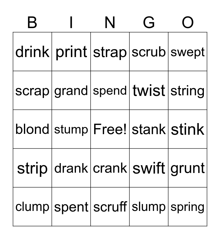 This bingo card has a free space and 26 words: crank, slump, spend, spent, swept, drink, scrap, print, stink, swift, twist, blond, grunt, clump, stump, split, scrub, strip, strap, spring, string, scruff, stank, drank, grand and plank.