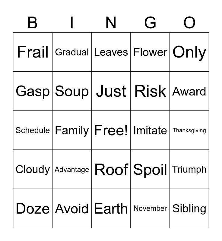 This bingo card has a free space and 24 words: Advantage, Avoid, Just, Doze, Only, Frail, Gasp, Gradual, Imitate, Roof, Risk, Schedule, Spoil, Triumph, Soup, November, Thanksgiving, Leaves, Award, Family, Sibling, Cloudy, Flower and Earth.