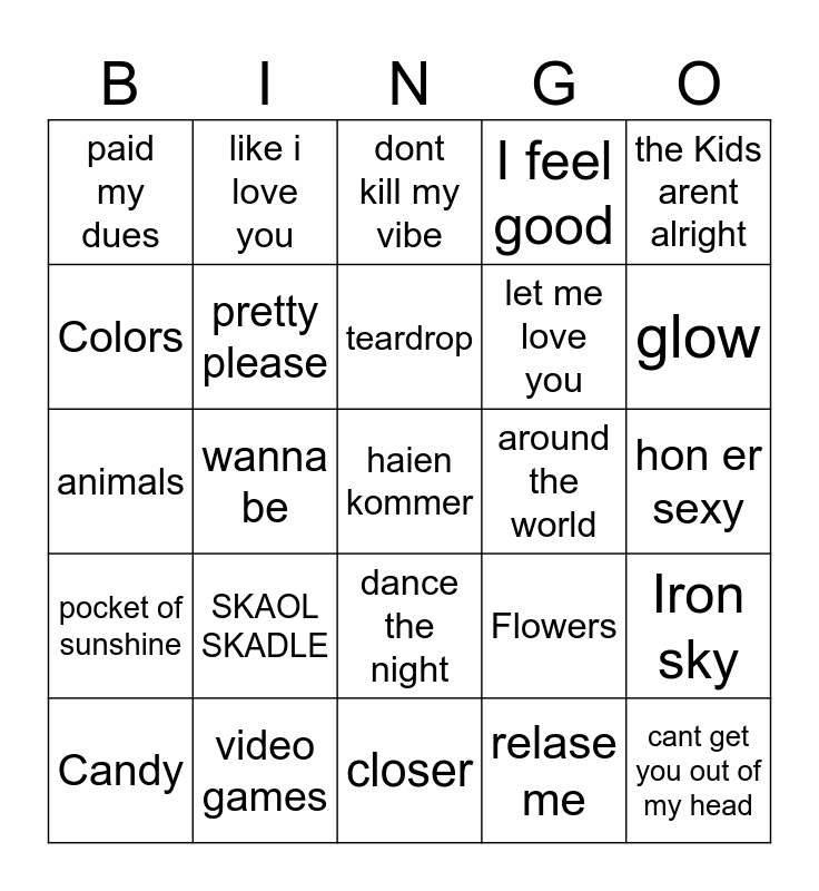 This bingo card has 30 words: video games, aint your mama, wanna be, watcha say, paid my dues, dont kill my vibe, pretty please, dance the night, around the world, closer, hon er sexy, haien kommer, relase me, cant get you out of my head, glow, Lady, Flowers, pocket of sunshine, SKAOL SKADLE, the Kids arent alright, animals, BAP, like i love you, let me love you, Colors, I feel good, Iron sky, Candy, teardrop and Sway.