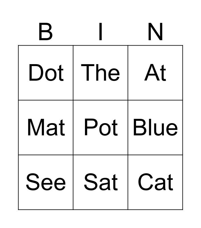 This bingo card has 9 words: See, At, The, Mat, Dot, Blue, Pot, Cat and Sat.