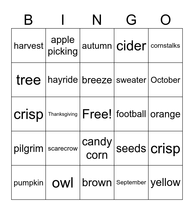 This bingo card has a free space and 29 words: pumpkin, Halloween, Thanksgiving, leaves, harvest, autumn, hayride, scarecrow, football, owl, orange, yellow, brown, September, October, November, candy corn, pilgrim, cornstalks, crisp, seeds, hay bale, sweater, tree, cider, apple picking, crisp, breeze and back to school.