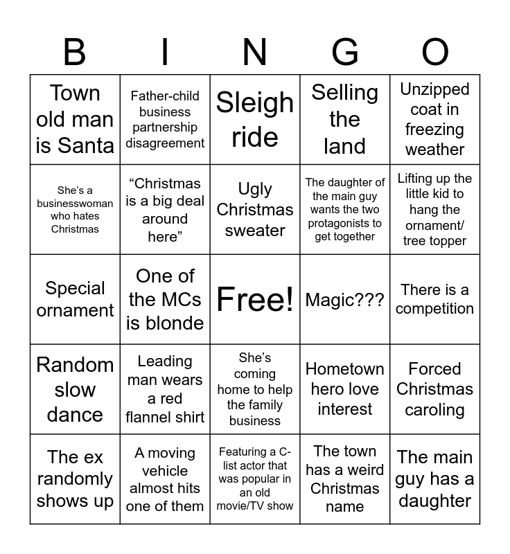 This bingo card has a free space and 54 words: A barn, Random slow dance, The main character’s mom or dad died, Man is a widower, She’s coming home to help the family business, He’s a real estate developer, Selling the land, The girl gets mad first, She’s a businesswoman who hates Christmas, They get stuck under the mistletoe, Town old man is Santa, “Oh, we’re not together”, A moving vehicle almost hits one of them, The ex randomly shows up, They are trying to build condos on the land, Featuring a C-list actor that was popular in an old movie/TV show, The main guy has a daughter, The daughter of the main guy wants the two protagonists to get together, A random old-town tradition, There is a competition, Hometown hero love interest, The girl already has a big-city boyfriend/ husband, Magic???, Unzipped coat in freezing weather, Making cookies scene, Father-child business partnership disagreement, Christmas party, Christmas Festival, A demanding boss only cares about money, The town has a weird Christmas name, Car breaks down, Tree cutting scene, “A Christmas miracle”, Talk about the meaning of Christmas, Sleigh ride, The female main character wears a red dress, Special ornament, Forced Christmas caroling, It snows on Christmas, “Christmas is a big deal around here”, Cancelled flight/ snowed in, Airport scene, Her job is as a baker/ wedding planner/ journalist, Sentimental gift that makes the MC rethink their actions, Leading man wears a red flannel shirt, Flirtatious snowball fight, Charity Santa ringing a bell, Leading Man plays guitar, Ugly Christmas sweater, One of the MCs is blonde, Lifting up the little kid to hang the ornament/ tree topper, Leading man is not forthcoming about his real job, The leading woman wakes up in full makeup and her hair done and Threatened by layoffs.