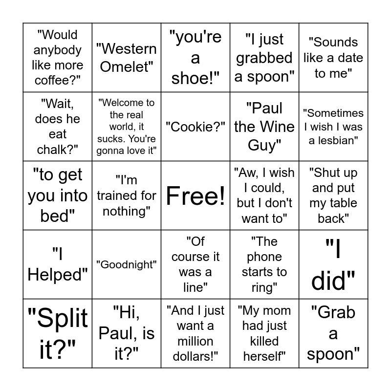 This bingo card has a free space and 24 words: "Split it?", "Goodnight", "Cookie?", "My mom had just killed herself", "Sounds like a date to me", "Would anybody like more coffee?", "Western Omelet", "you're a shoe!", "Aw, I wish I could, but I don't want to", "Shut up and put my table back", "to get you into bed", "Welcome to the real world, it sucks. You're gonna love it", "The phone starts to ring", "I did", "Wait, does he eat chalk?", "Hi, Paul, is it?", "And I just want a million dollars!", "I just grabbed a spoon", "Sometimes I wish I was a lesbian", "I Helped", "I'm trained for nothing", "Of course it was a line", "Paul the Wine Guy" and "Grab a spoon".