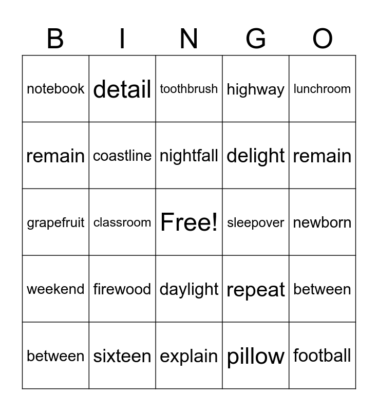 This bingo card has a free space and 40 words: bathroom, grapefruit, driveway, coastline, sixteen, daylight, nightfall, bedroom, lunchroom, weekend, classroom, highway, football, newborn, sleepover, firewood, classroom, notebook, coastline, toothbrush, between, pillow, delight, remain, reveal, raccoon, lightning, cartoon, window, display, detail, between, yellow, repeat, remain, explain, pillow, contain, detail and delight.