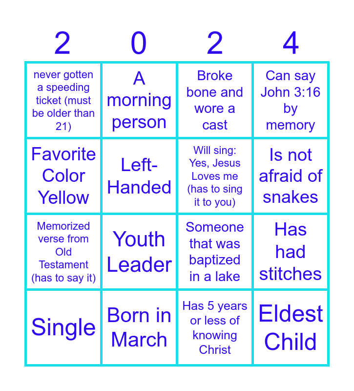 This bingo card has 20 words: Has had stitches, Dislikes drinking water, Broke bone and wore a cast, Has lived outside of Texas, Single, Favorite Color Yellow, Born in March, never gotten a speeding ticket (must be older than 21), Memorized verse from Old Testament (has to say it), A morning person, Youth Leader, Someone that was baptized in a lake, Left-Handed, Eldest Child, Will sing: Yes, Jesus Loves me (has to sing it to you), More than 10 years as a Christian, Is not afraid of snakes, Can say John 3:16 by memory, Has 5 years or less of knowing Christ and Someone that can say 5 verses from the Bible.