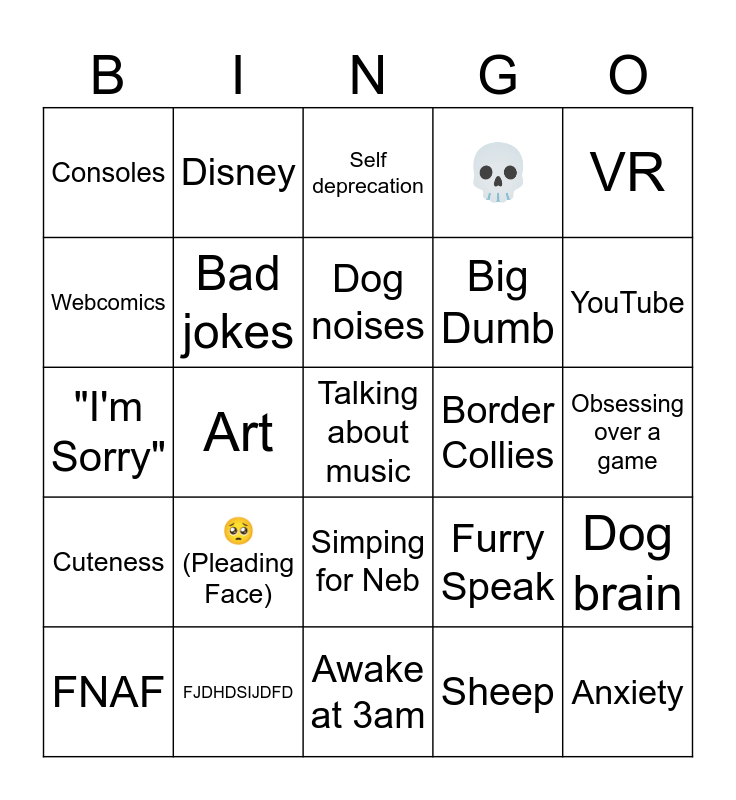 This bingo card has a free space and 24 words: 🥺 (Pleading Face), FJDHDSIJDFD, Dog noises, FNAF, VR, Consoles, Webcomics, Disney, Border Collies, Simping for Neb, Big Dumb, "I'm Sorry", Furry Speak, Dog brain, Bad jokes, Sheep, Obsessing over a game, Self deprecation, YouTube, Art, Anxiety, Cuteness, 💀 and Awake at 3am.