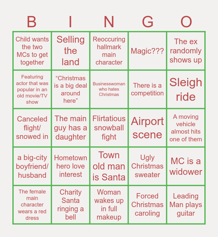 This bingo card has 64 words: A barn, Random slow dance, The main character’s mom or dad died, MC is a widower, She’s coming home to help the family business, He’s a real estate developer or Sheriff, Selling the land, The girl gets mad first, Businesswoman who hates Christmas, They get stuck under the mistletoe, Town old man is Santa, “Oh, we’re not together”, A moving vehicle almost hits one of them, The ex randomly shows up, They are trying to build condos on the land, Featuring actor that was popular in an old movie/TV show, The main guy has a daughter, Child wants the two MCs to get together, A random old-town tradition, There is a competition, Hometown hero love interest, a big-city boyfriend/ husband, Magic???, Unzipped coat in freezing weather, Making cookies scene, Father-child business partnership disagreement, Christmas party, Christmas Festival, A demanding boss only cares about money, The town has a weird Christmas name, Car breaks down, Tree cutting scene, “A Christmas miracle”, Talk about the meaning of Christmas, Sleigh ride, The female main character wears a red dress, Special ornament, Forced Christmas caroling, It snows on Christmas or Christmas eve, “Christmas is a big deal around here”, Canceled flight/ snowed in, Airport scene, She’s a baker/ wedding planner/ journalist, Sentimental gift makes MC rethink their actions, MC man wears a red flannel, Flirtatious snowball fight, Charity Santa ringing a bell, Leading Man plays guitar, Ugly Christmas sweater, One of the MCs is blonde, Lifting up kid to hang ornament/ tree topper, Leading man not forthcoming about his real job, Woman wakes up in full makeup, Threatened by layoffs, Military, Gazebo scene, Reoccuring hallmark main character, “When I was little”, Good cook bad cook, Run after the love interest, Prolonged eye contact, A talkative and knowledgeable child, Wrapping gifts scene and A crown/ Royalty.