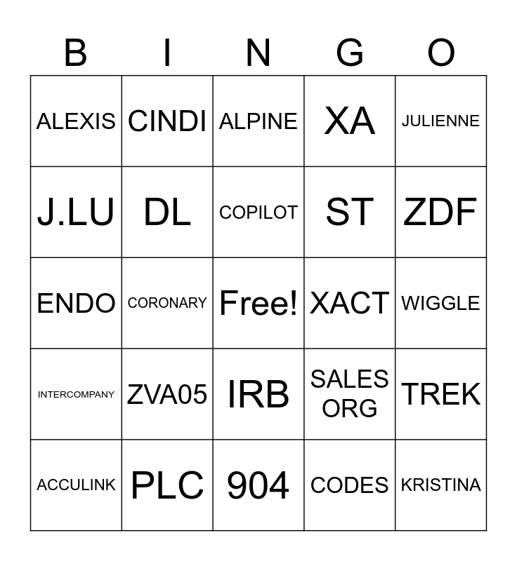 This bingo card has a free space and 58 words: Demo, PLC, CDM, INTERCOMPANY, CODES, AC, DL, CA, ST, DES, XA, WR, OCT, CONNIE, JERI, ALEXIS, KRISTINA, JULIENNE, ALI, COPILOT, XACT, ALPINE, ACCULINK, TREK, NEO, WIGGLE, ZSOR, VC, ZDF, ZFRE, ZSRR, VAP, ZSBB, TAN, CIS, TOOLBOX, PBi, CORONARY, ENDO, VF03, ZVA05, VA03, SALES ORG, 2000, 210, GRAFTMASTER, 2395, IRB, 904, 5 MINS, 10 SECS, 4PM, REPORTS, ANN SHAW, CINDI, MARY, J.LU and 94%.