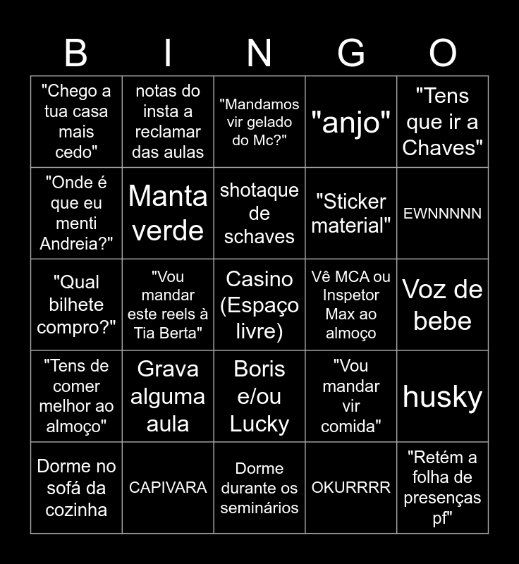 This bingo card has a free space and 29 words: Dorme no sofá da cozinha, Manda audio ao Pedro, "Vou mandar este reels à Tia Berta", "Podes dar boleia para a PAC?", "Chego a tua casa mais cedo", "Mandamos vir gelado do Mc?", Manta verde, Grava alguma aula, Vê MCA ou Inspetor Max ao almoço, CAPIVARA, Voz de bebe, "Retém a folha de presenças pf", Dorme durante os seminários, OKURRRR, EWNNNNN, "Já chega de Taylor Swift", Boris e/ou Lucky, "Tens de comer melhor ao almoço", "Tens que ir a Chaves", "Qual bilhete compro?", "Vou mandar vir comida", "MIAU!", "Sticker material", "Onde é que eu menti Andreia?", "anjo", notas do insta a reclamar das aulas, husky, shotaque de schaves and mini xoxotinha.