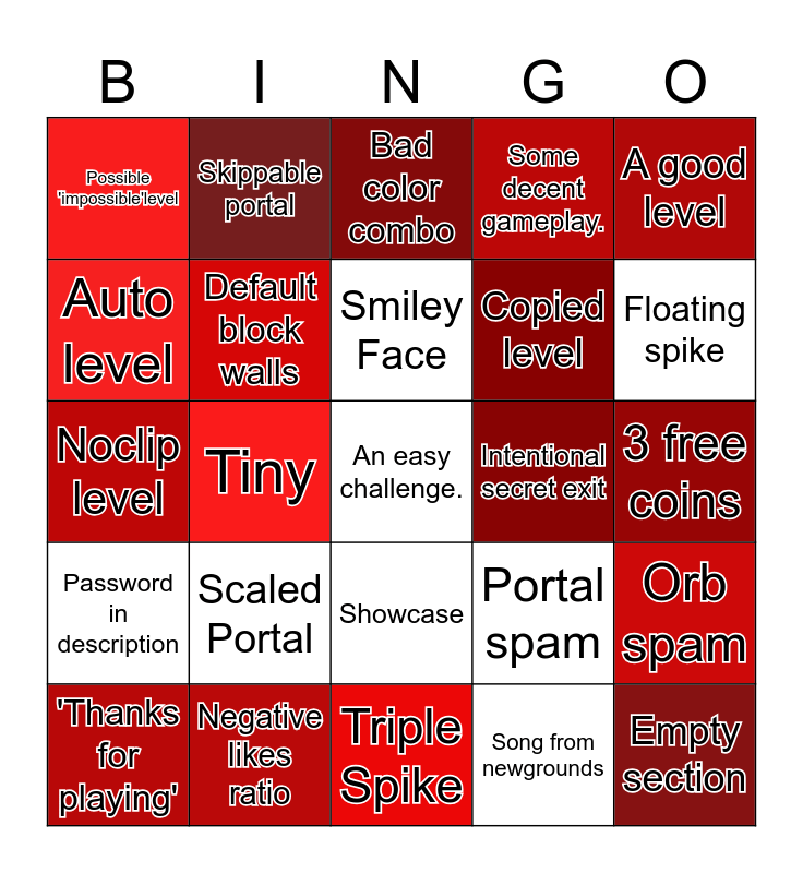This bingo card has 25 words: Scaled Portal, Triple Spike, Smiley Face, 'Thanks for playing', A good level, Possible 'impossible'level, Auto level, Skippable portal, Intentional secret exit, Showcase, Copied level, Noclip level, Portal spam, Orb spam, Default block walls, Empty section, 3 free coins, Bad color combo, Floating spike, Tiny, An easy challenge., Negative likes ratio, Password in description, Some decent gameplay. and Song from newgrounds.