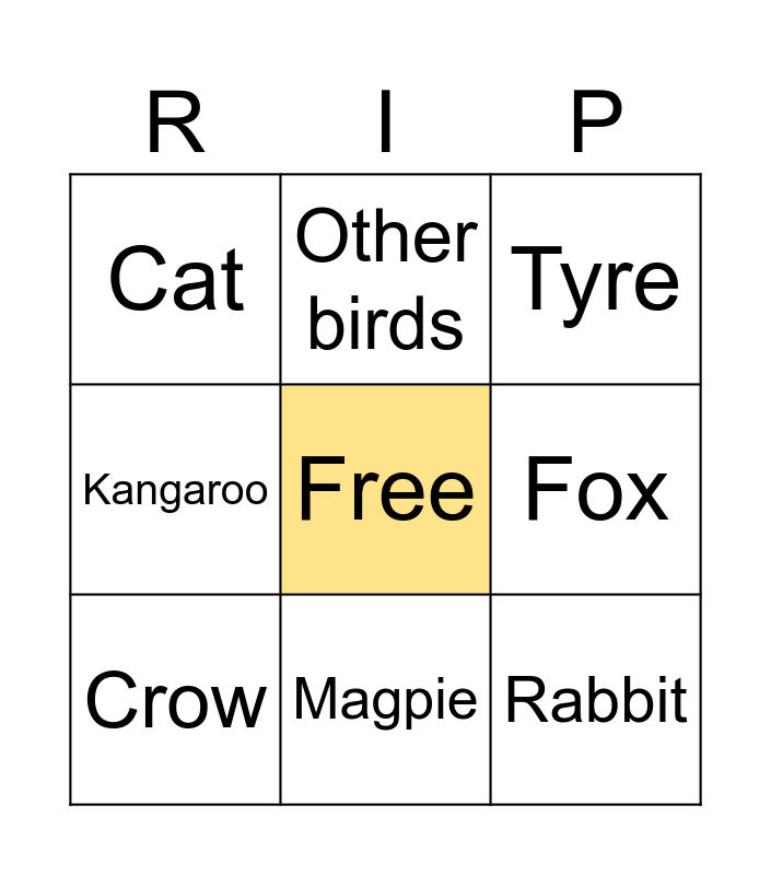 This bingo card has a free space and 8 words: Fox, Tyre, Other birds, Crow, Cat, Rabbit, Kangaroo and Magpie.