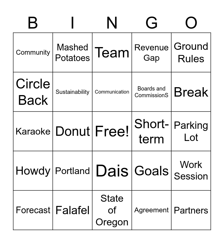 This bingo card has a free space and 55 words: Washington County, Forecast, Multicultural Center, Community, State of Oregon, DEI, Sustainability, Hillsboro, Boards and CommissionS, Governance, Revenue Gap, Roles and Responsibilities, City Manager, Lunch, Policy, Consensus, Ground Rules, Donut, Clarity, Partners, Short-term, Long-term, Goals, Team, Budget, Communication, Agreement, Tree Canopy, Parking Lot, Work Session, City Attorney, Equitable, Annexation, Transportation, Circle Back, Karaoke, Council President, Howdy, Adjourn, Turkey, Mashed Potatoes, Can’t Touch This, Sometimes You gotta throw sauce at your boss, Go Ducks, Portland, Falafel, Traffic, Yahtzee, Housing, Break, Picasso, Coffee, Bathroom, Dais and Taylor Swift.