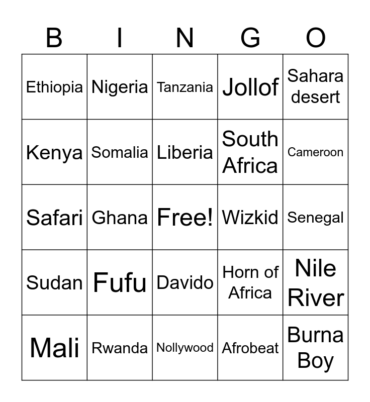 This bingo card has a free space and 27 words: Horn of Africa, Chad, South Africa, Nollywood, Kenya, Tanzania, Nigeria, Sudan, Wizkid, Nile River, Safari, Jollof, Mali, Rwanda, Cameroon, Nelson Mandela, Somalia, Liberia, Fufu, Ethiopia, Senegal, Afrobeat, Ghana, Burna Boy, Davido, Sahara desert and Rema.