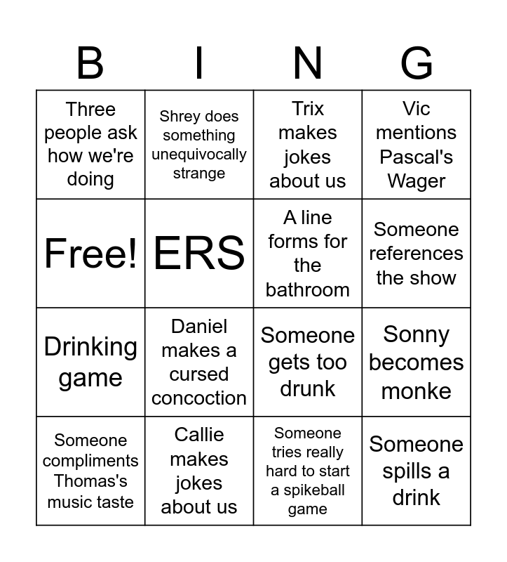 This bingo card has 16 words: Callie makes jokes about us, Sonny becomes monke, Trix makes jokes about us, Three people ask how we're doing, Drinking game, Shrey does something unequivocally strange, Someone gets too drunk, Someone tries really hard to start a spikeball game, Free!, ERS, Someone compliments Thomas's music taste, Vic mentions Pascal's Wager, Daniel makes a cursed concoction, Someone references the show, A line forms for the bathroom and Someone spills a drink.