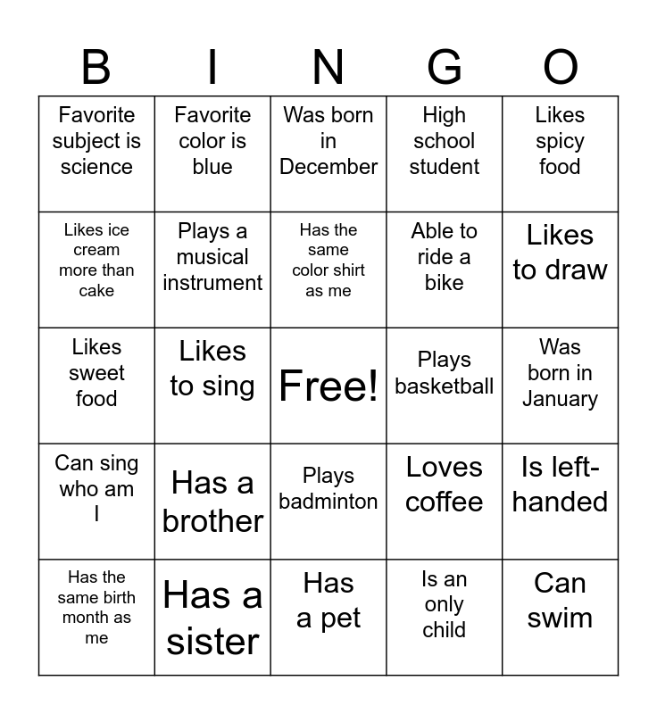 This bingo card has a free space and 24 words: Has a brother, Has a sister, Has the same color shirt as me, Has the same birth month as me, Likes spicy food, Favorite subject is science, Likes ice cream more than cake, Favorite color is blue, Plays basketball, Plays badminton, Able to ride a bike, Likes sweet food, Loves coffee, Is left-handed, Plays a musical instrument, Is an only child, Was born in January, Was born in December, Likes to draw, Likes to sing, Can swim, Can sing who am I, High school student and Has a pet.
