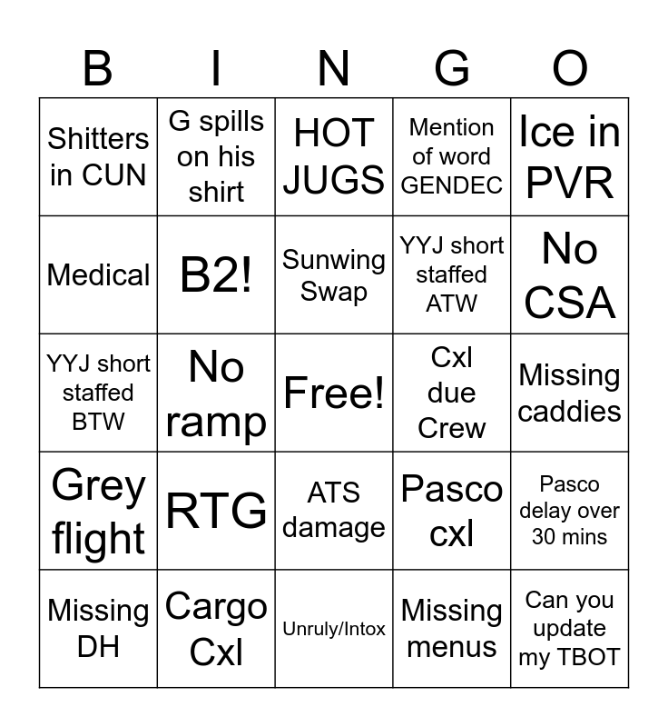 This bingo card has a free space and 24 words: RTG, Cargo Cxl, Sunwing Swap, Missing DH, Ice in PVR, Shitters in CUN, Medical, G spills on his shirt, Cxl due Crew, ATS damage, YYJ short staffed ATW, YYJ short staffed BTW, Pasco cxl, Pasco delay over 30 mins, B2!, Missing menus, Missing caddies, HOT JUGS, No CSA, No ramp, Can you update my TBOT, Grey flight, Mention of word GENDEC and Unruly/Intox.