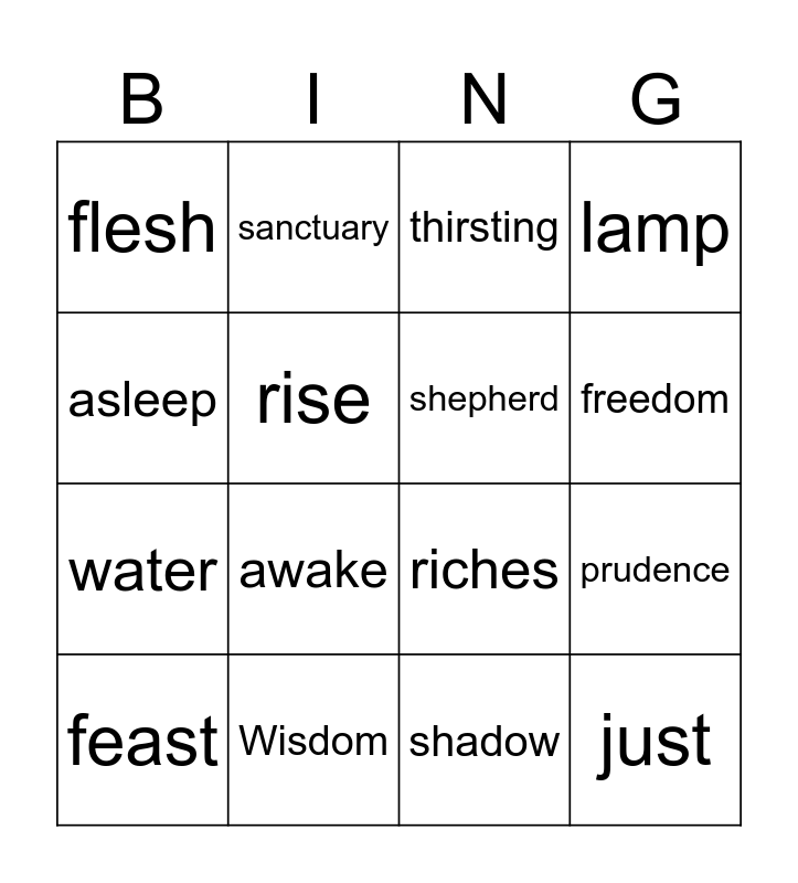 This bingo card has 16 words: Wisdom, prudence, thirsting, flesh, water, sanctuary, riches, shadow, asleep, rise, feast, lamp, awake, freedom, shepherd and just.