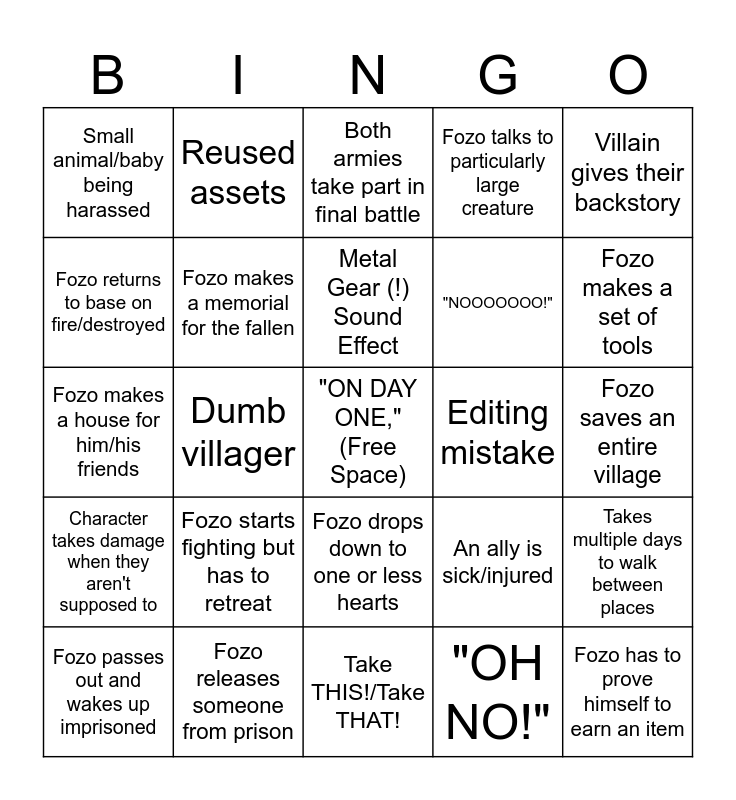 This bingo card has a free space and 32 words: "OH NO!", Family member permadeath at start of video, Dumb villager, Uses model inspired by/from a copyrighted series, Character takes damage when they aren't supposed to, Fozo makes a memorial for the fallen, Villain gives their backstory, Takes multiple days to walk between places, Reused assets, Sponsored content mid-video, Metal Gear (!) Sound Effect, Both armies take part in final battle, NPC villains having banter with each other, Friend sacrifices themselves for Fozo, Editing mistake, Fozo reverses a curse, Fozo passes out and wakes up imprisoned, Fozo makes a house for him/his friends, Fozo drops down to one or less hearts, Fozo starts fighting but has to retreat, An ally is sick/injured, Fozo gets caught stealing, Fozo saves an entire village, Fozo releases someone from prison, Fozo has to prove himself to earn an item, Fozo talks to particularly large creature, "NOOOOOOO!", Fozo returns to base on fire/destroyed, Small animal/baby being harassed, Take THIS!/Take THAT!, "down for the count" and Fozo makes a set of tools.