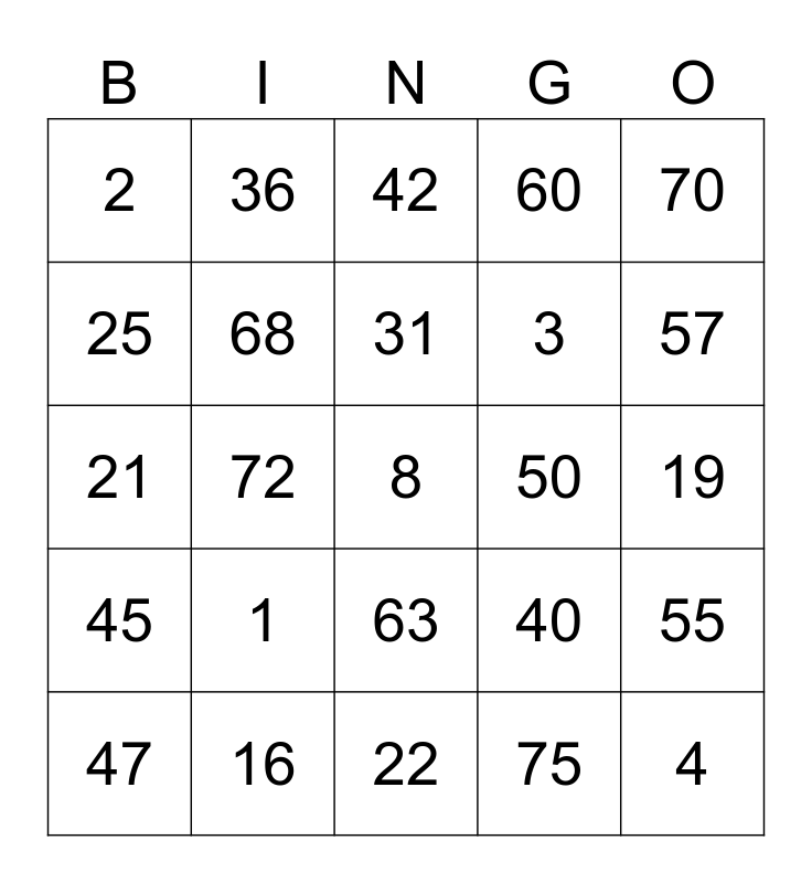 This bingo card has 25 words: 1, 22, 31, 47, 70, 2, 25, 36, 50, 63, 3, 21, 40, 55, 68, 4, 19, 42, 57, 72, 8, 16, 45, 60 and 75.
