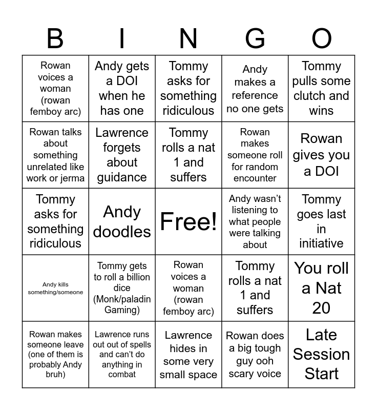 This bingo card has a free space and 72 words: Andy takes too long on his turn, Andy gets a DOI when he has one, Andy doodles, Andy corrects someone (nerd emoji), Andy kills something/someone, Andy wasn’t listening to what people were talking about, Andy makes a reference no one gets, Rowan does a big tough guy ooh scary voice, Rowan makes someone roll for random encounter, Rowan berates someone for being big idiot stupid, Rowan makes someone leave (one of them is probably Andy bruh), Rowan talks about something unrelated like work or jerma, Rowan gives you a DOI, Rowan voices a woman (rowan femboy arc), Tommy destroys in combat one turn then does nothing the next turn, Tommy asks for something ridiculous, Tommy rolls a nat 1 and suffers, Tommy pulls some clutch and wins, Tommy’s mother brings him away, Tommy goes last in initiative, Tommy gets to roll a billion dice (Monk/paladin Gaming), Late Session Start, You roll a Nat 20, You roll a Nat 1, Late Session Start, You roll a Nat 20, You roll a Nat 1, Lawrence experiences a near death experience, Lawrence hides in some very small space, Lawrence makes something, Lawrence runs out out of spells and can’t do anything in combat, Lawrence forgets about guidance, Lawrence gets Waldwin drunk, Lawrence hides in his bag of holding instead of facing a threat, Rowan does a big tough guy ooh scary voice, Rowan makes someone roll for random encounter, Rowan berates someone for being big idiot stupid, Rowan makes someone leave (one of them is probably Andy bruh), Rowan talks about something unrelated like work or jerma, Rowan gives you a DOI, Rowan voices a woman (rowan femboy arc), Andy takes too long on his turn, Andy gets a DOI when he has one, Andy doodles, Andy corrects someone (nerd emoji), Andy kills something/someone, Andy wasn’t listening to what people were talking about, Andy makes a reference no one gets, Andy takes too long on his turn, Andy gets a DOI when he has one, Andy doodles, Andy corrects someone (nerd emoji), Andy kills something/someone, Andy wasn’t listening to what people were talking about, Andy makes a reference no one gets, Tommy destroys in combat one turn then does nothing the next turn, Tommy asks for something ridiculous, Tommy rolls a nat 1 and suffers, Tommy pulls some clutch and wins, Tommy’s mother brings him away, Tommy goes last in initiative, Tommy gets to roll a billion dice (Monk/paladin Gaming), Lawrence experiences a near death experience, Lawrence hides in some very small space, Lawrence makes something, Lawrence runs out out of spells and can’t do anything in combat, Lawrence forgets about guidance, Lawrence gets Waldwin drunk, Lawrence hides in his bag of holding instead of facing a threat, Late Session Start, You roll a Nat 20 and You roll a Nat 1.